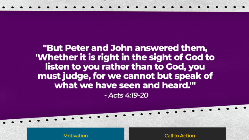 Verse: "But Peter and John answered them, 'Whether it is right in the sight of God to listen to you rather than to God, you must judge, for we cannot but speak of what we have seen and heard.'" - Acts 4:19-20 Motivation: Peter and John boldly proclaimed their faith